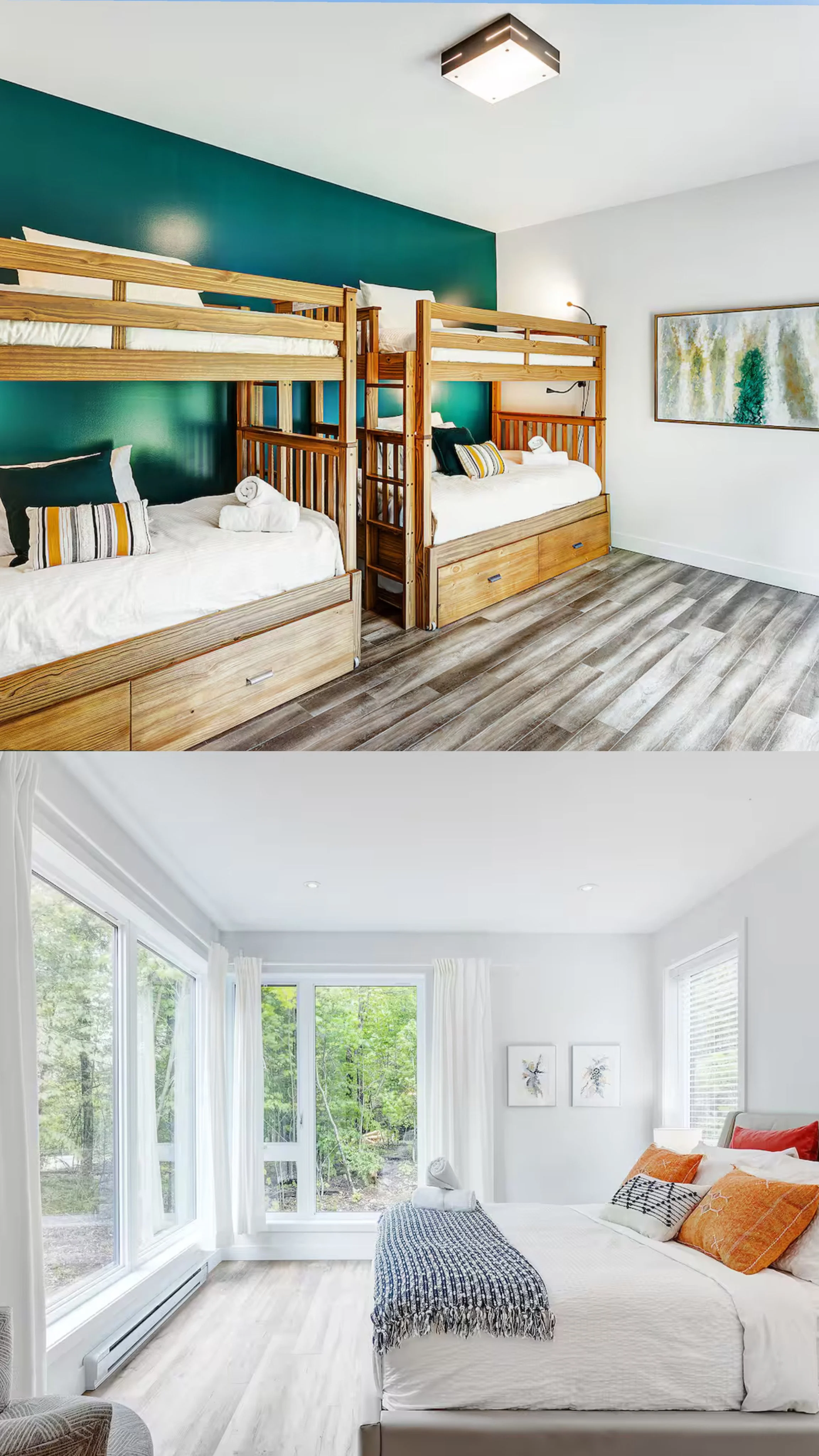 The chalet has four bedrooms. Two rooms each have a king bed and are reserved privately for couples.